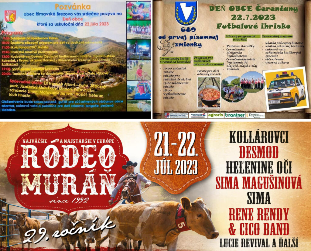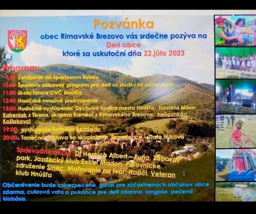 Obec Rimavské Brezovo vás pozýva na tohtoročný Deň obce. Konať sa bude už túto sobotu (22. júla) a začne sa o 9-tej hodine na športovom ihrisku. Čakať na vás bude športový program, aktivity pre deti, kultúrne vystúpenia regionálnych folklóristov, ale aj slovenského speváka Tomáš Bezdedu, tanečná zábava a ďalší sprievodný program.