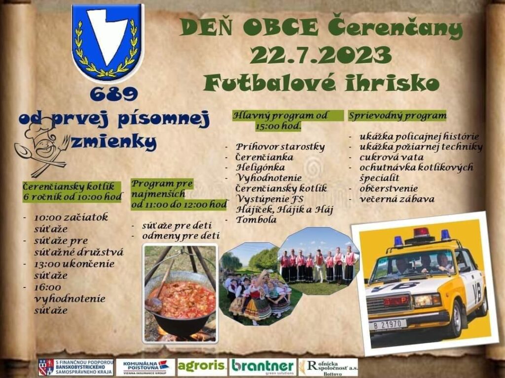 Túto sobotu (22. júla) sa bude konať aj Deň obce Čerenčany, ktorý bol z júna preložený kvôli nepriaznivému počasiu. Pripravený bude 6. ročník súťaže Čerenčiansky kotlík, súťaže pre deti, kultúrny program, ukážka policajnej histórie a ďalšie sprievodné aktivity.