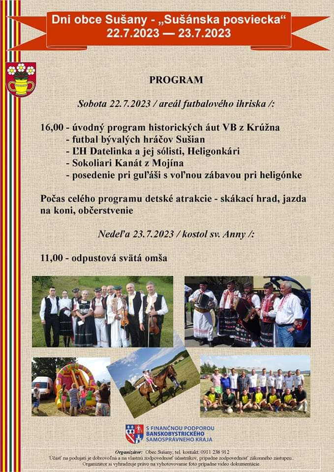 Dni obce Sušany sa v sobotu (22. júla) budú konať v areáli futbalového ihriska. Program sa začne o 16-tej hodine prehliadkou historických vozidiel, pokračovať bude futbalom bývalých hráčov Sušian a vystúpeniami ľudových umelcov. Posedieť si môžete pri guľáši a hudbe. Pripravené budú aj detské atrakcie pre deti.