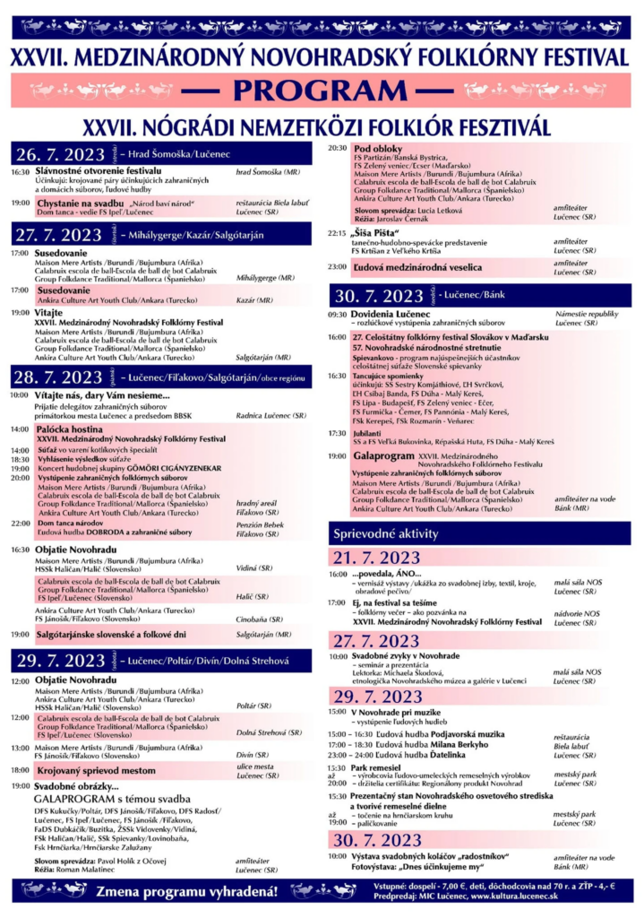 V poslednom júlovom týždni (26. – 30. 7.) budete môcť navštíviť niekoľko zaujímavých miest v Novohrade, kde na vás bude čakať bohatý folklórny program. Súčasťou XXVII. Medzinárodného Novohradského folklórneho festivalu budú, okrem súborov zo Slovenska, aj vystúpenia zahraničných súborov z Maďarska, Afriky, Španielska i Turecka.