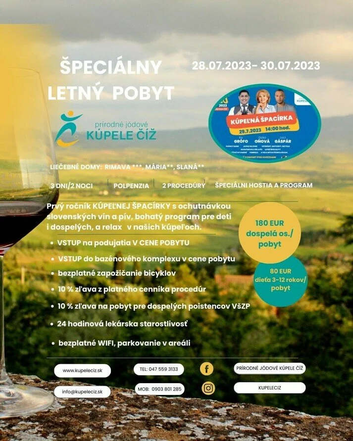 Prírodné jódové kúpele si pre svojich návštevníkov už túto sobotu (29. júla) pripravili celodenný program, počas ktorého zažijú nielen zábavu, ale najmä oddych. Kúpeľná špacírka štartuje o 14-tej sprievodným programom. Užiť si môžete jazdu na koni a výstavu veteránov, motoriek či bicyklov. Súčasťou programu je aj ochutnávka vín, letných špecialít a pokiaľ ste zdatný kuchár, môžete sa prihlásiť na súťaž vo varení.