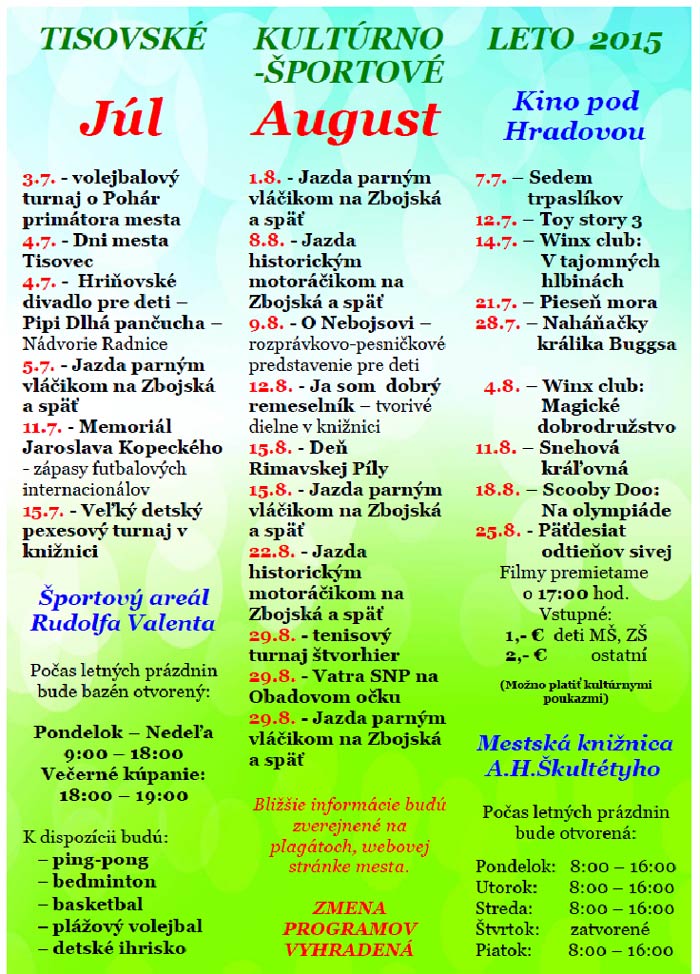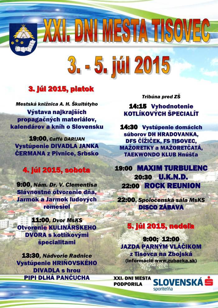 Program tohtoročných osláv Dní mesta Tisovec, ktoré začínajú už v piatok, 3. júla, budú prevažne v domácej réžii. Ako Rimava.sk ďalej informoval primátor Tisovca Peter Mináč, program tvorili tak, aby mali čo najnižšie náklady. „Ide hlavne o to, aby sme neprerušili tradíciu a aby sa občania mohli stretnúť, porozprávať sa,“ povedal Mináč, podľa ktorého v rámci kultúrno-športového leta občanom sprístupnia telocvične ako aj športový areál. „Tešíme sa hlavne mimoriadnemu záujmu o bazén, kde mali deti voľný vstup do 14-tej hodiny,“ doplnil Mináč. Podľa vedúcej oddelenia kultúry v Tisovci Miroslavy Kojnokovej predpokladané náklady na oslavy Dní mesta sú vo výške 5 tis. eur, hradené budú hlavne z rozpočtu mesta. Trojdňové oslavy začnú otvorením výstavy najkrajších propagačných materiálov, kalendárov a kníh o Slovensku. „V kategórii mestá a obce sme na nej s obrazovou publikáciou Milana Slabeja získali druhé miesto,“ pripomenula Kojnoková a dodala, že výstava je putovná a v Tisovci ju budú môcť vidieť v priebehu júla. V sobotu dopoludnia čaká obyvateľov Tisovca jarmok a varenie kotlíkových špecialít. Popoludní vystúpia podľa Kojnokovej na zapožičanej väčšej tribúne domáce súbory DH Hradovanka, DFS Čížiček, FS Tisovec, mažoretky a mažoretčatá ako aj Taekwondo klub Hnúšťa, ktorému pribúdajú úspechy na tatami.