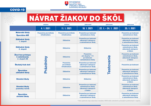 Od 11. januára budú všetky školy pokračovať dištančným spôsobom výučby. Otvorené budú len materské školy pre deti zákonných zástupcov z kritickej infraštruktúry a pre deti rodičov, ktorým povaha práce nedovoľuje pracovať z domu. „Zriaďovateľom odporúčame otvoriť školské kluby detí najmä pre deti zdravotníkov, ako aj pre deti rodičov z kritickej infraštruktúry či pre deti rodičov, ktorí nemôžu pracovať z domu. Od 11. do 18. januára bude vyplácaná pandemická OČR. Zriaďovateľom zároveň odporúčame pretestovať všetkých zamestnancov, pričom náklady im budú preplatené,“ upresnil minister školstva.