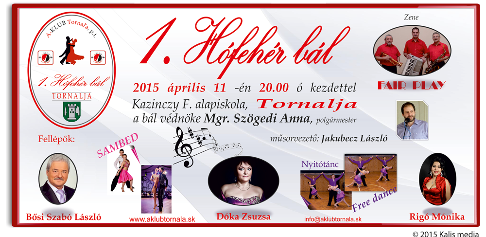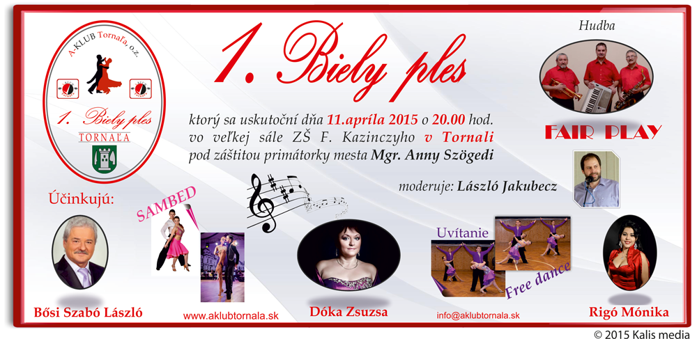 Ples, nad ktorým prebrala záštitu primátorka mesta Anna Szögedi, sa uskutoční v sobotu, 11. apríla, o 20.00 hod. vo veľkej sále Základnej školy F. Kazinczyho v Tornali. Biely ples je súčasťou plánu činností novozaloženého klubu, ktorý podáva pomocnú ruku k zdravému a triezvemu spôsobu života. Členovia sa stretávajú každú sobotu, pre závislých od alkoholu, drog a hazardu organizujú prednášky.