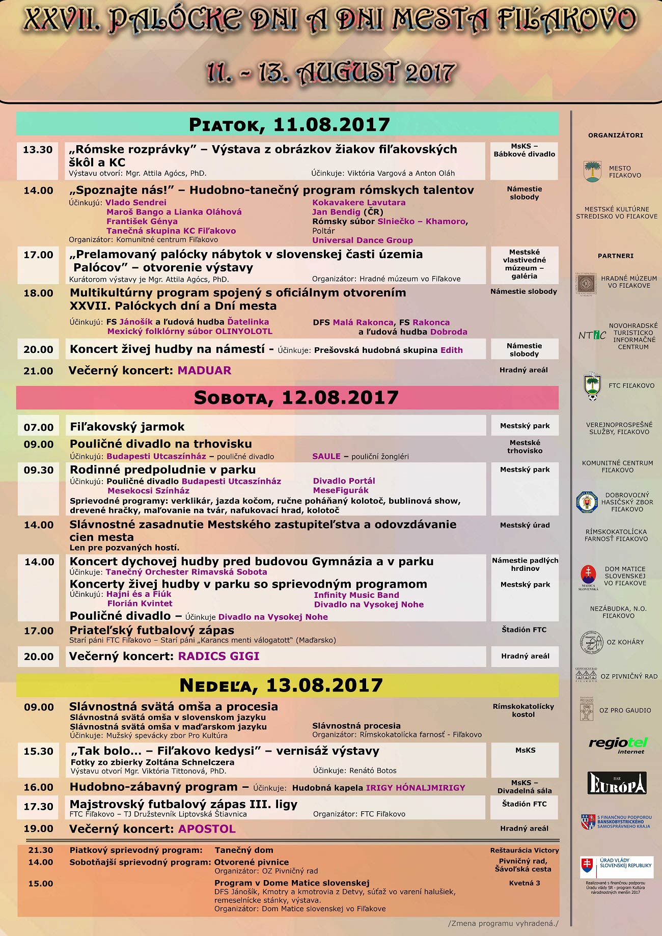 Podľa jej slov festival začína v piatok, 11. augusta, popoludní na Námestí slobody hudobno-tanečným programom rómskych talentov s názvom Spoznajte nás!, pred ktorým sa v Bábkovej sále MsKS koná slávnostné otvorenie výstavy Rómske rozprávky. „Prvý deň série podujatí pokračuje na inom mieste, v Mestskom vlastivednom múzeu vernisážou Prelamovaný palócky nábytok v slovenskej časti územia Palócov, odkiaľ bude ľudí sprevádzať hudobný sprievod naspäť na Námestie slobody, kde sa uskutoční oficiálne otvorenie trojdňového podujatia,“ priblížila a dodala, že kurátorom výstavy o nábytku bude primátor Fiľakova Attila Agócs. Ako ďalej spomenula, v piatkovom multikultúrnom programe vystúpi okrem domácich súborov aj Mexický folklórny súbor Olinyolotl. Na tomto pódiu sa predstaví aj Prešovská hudobná skupina Edith s repertoárom známych pesničiek, upravených do smooth jazz, blues či jazzrockového štýlu. Sprievodným programom prvého dňa bude tanečný dom s kapelou Dobroda. „Piatkový deň ukončí na hradnom nádvorí koncert skupiny Maduar, na ktorom budú mať záujemcovia možnosť vypočuť si aj také hity, ako napr. Ramaya, La chita alebo Hafanana,“ dodala riaditeľka s tým, že neoddeliteľnou súčasťou Dní mesta je Fiľakovský jarmok v mestskom parku.