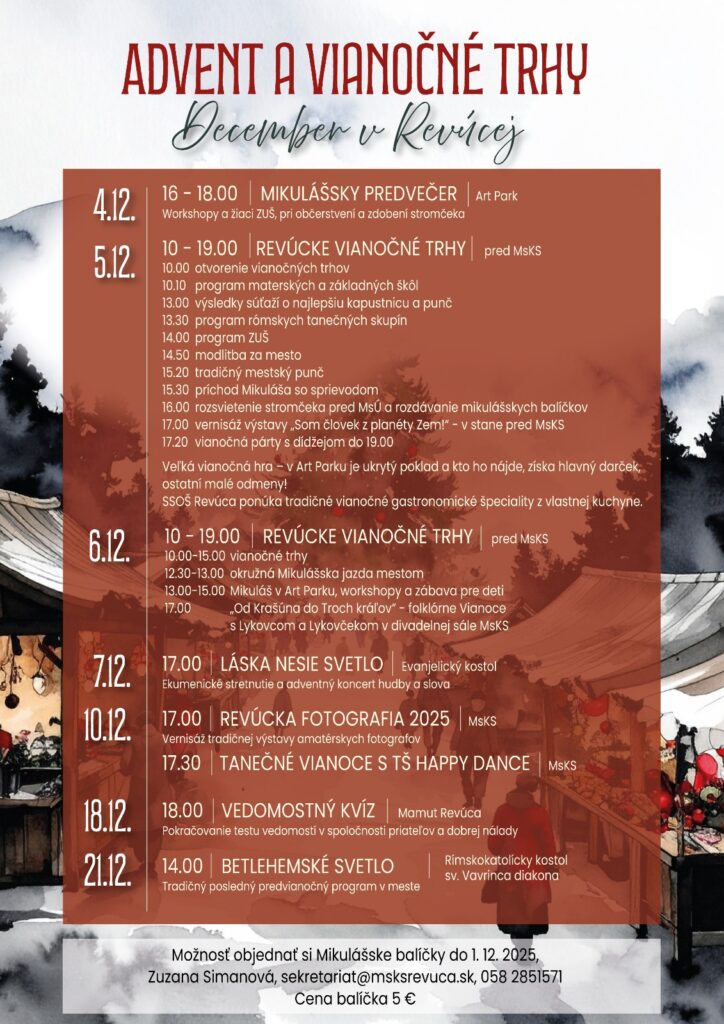 Hlavným lákadlom sú nepochybne Revúcke Vianočné trhy. Po ich oficiálnom otvorení čaká prítomných vystúpenie žiakov základných a materských škôl, uvidia tance rómskych folklórnych skupín a zažijú vianočnú zábavu s DJ-om. Vrcholom dňa bude príchod samotného Mikuláša, ktorý prinesie balíčky a radosť najmä tým najmenším. Nezabudnite ani na veľkú vianočnú hru!