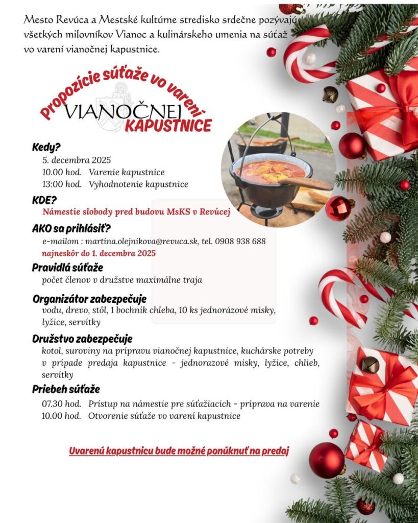 5. decembra sa centrum mesta Revúca naplní vôňou tradičnej kapustnice a vianočného punču. Námestie slobody sa premení na centrum vianočných tradícií.