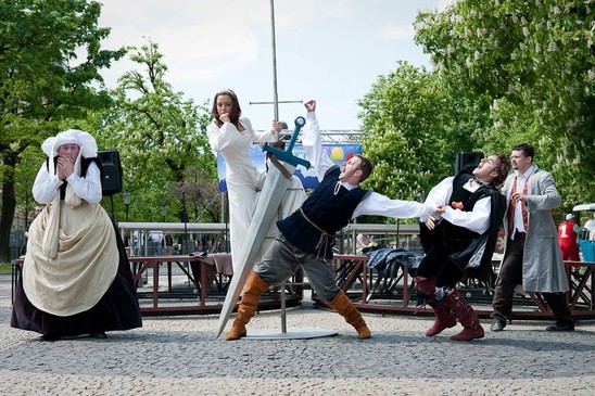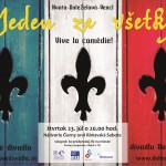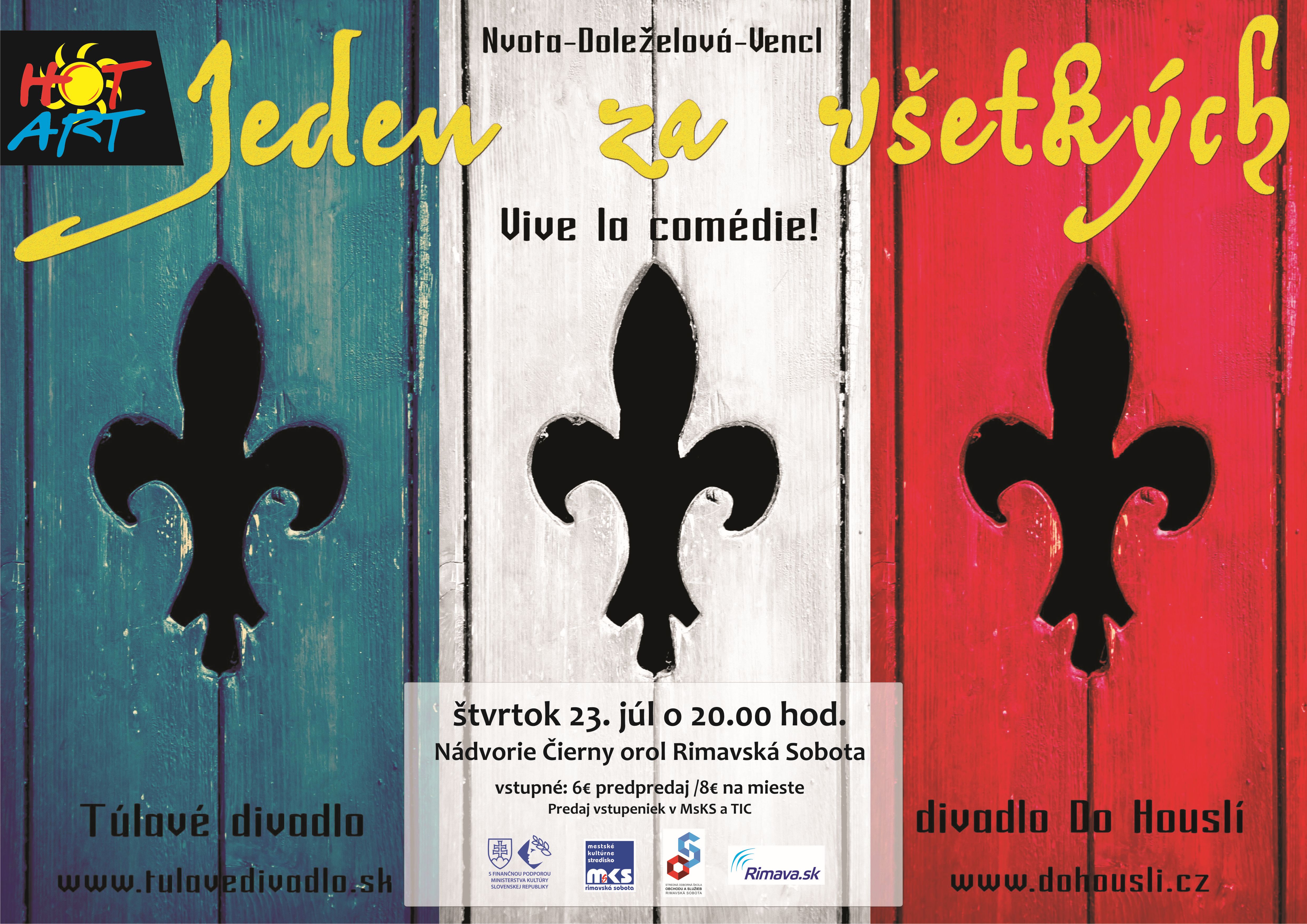 tulave-divadloJeden za všetkých - je pouličné predstavenie čerpajúce z klasického námetu Troch mušketierov. Čo je pre potulnú skupinu komediantov výzva. Základom je heslo: Hlavne sa netvárme, že sme Angličania, keď nie sme Francúzi !!! Pripravte sa na to, že herci zahrajú klasický príbeh celkom inak. "Divákov pozývame na spoločný slovensko-český projekt Túlavého divadla a Divadla Do houslí od autorskej trojice Jakuba Nvotu, Michaely Doleželovej a Romana Vencla," informovala Rimava.sk Regina Špitálová z Mestského kultúrneho strediska, ktoré HOT ART organizuje.