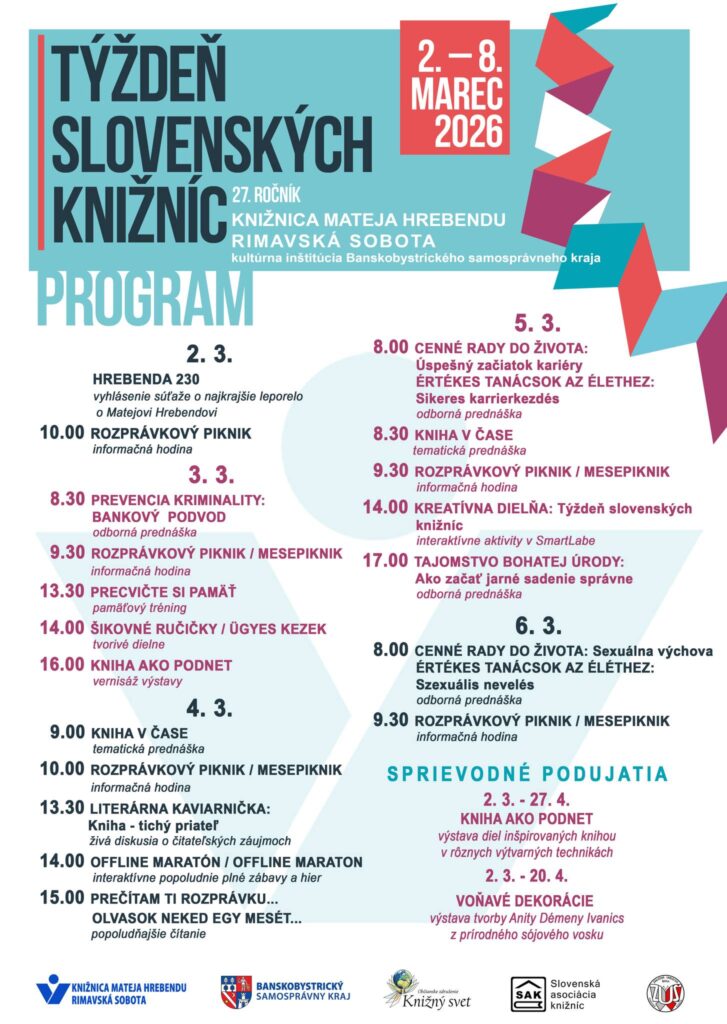 Knižnica Mateja Hrebendu otvára svoje brány dokorán. Pri príležitosti 27. ročníka celoslovenského podujatia „Týždeň slovenských knižníc“ pripravila pre obyvateľov mesta a okolia bohatý program, ktorý potrvá od 2. do 8. marca 2026.