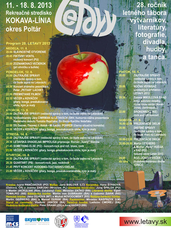 Dvadsiaty ôsmy ročník umeleckého tábora LETAVY organizujú Mestské kultúrne stredisko Rimavská Sobota a Občianske združenie Oxymoron v spolupráci so Základnou umeleckou školou. Podujatie sa uskutoční s finančnou podporou Ministerstva kultúry SR a sponzorov z radov podnikateľov a súkromných osôb.