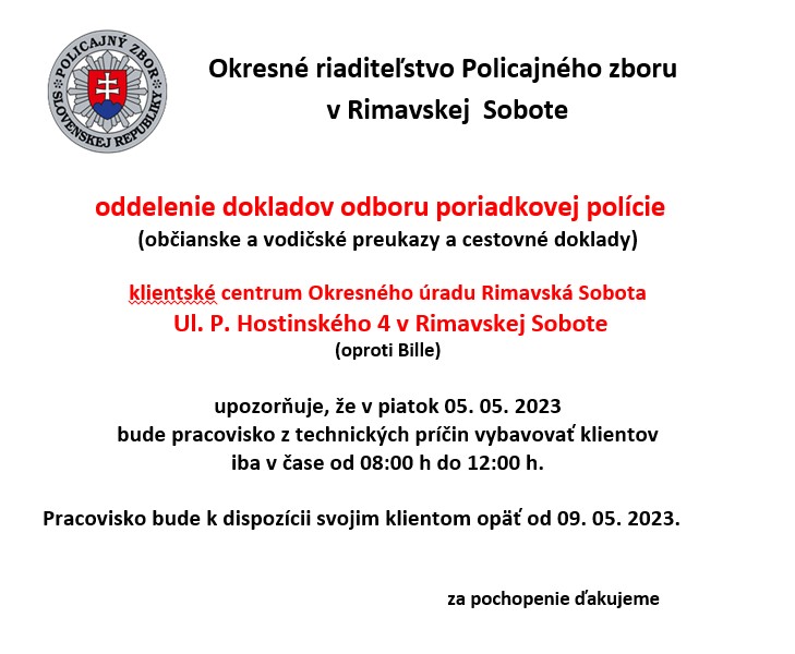 RIMAVSKÁ SOBOTA – Oddelenie dokladov odboru poriadkovej polície (občianske a vodičské preukazy a cestovné doklady) upozorňuje, že klientske centrum Okresného úradu Rimavská Sobota na Ulici P. Hostinského č. 4 (oproti Bille) bude v piatok (5. mája) fungovať v obmedzenom režime.