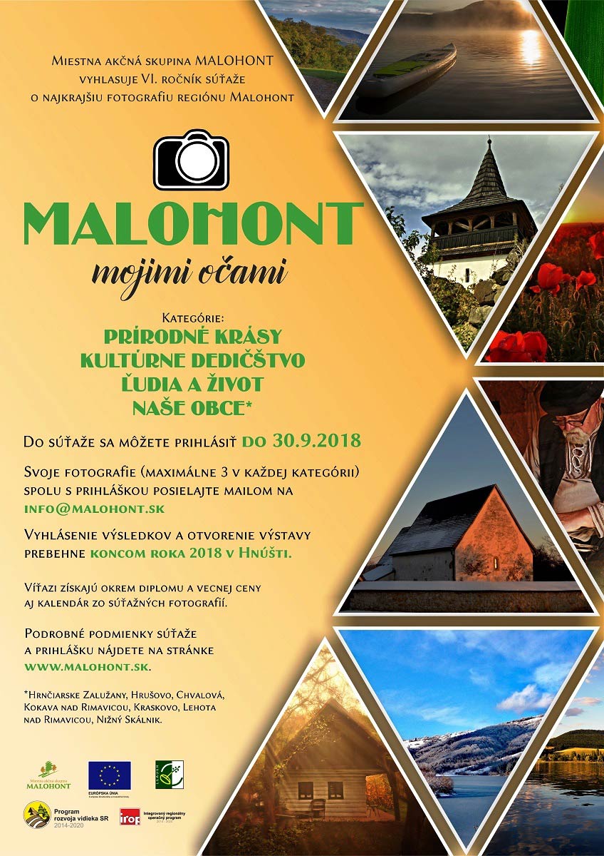 Miestna akčná skupina Malohont vyhlásila 6. ročník fotografickej súťaže Malohont mojimi očami, ktorá je určená pre malých aj veľkých, amatérskych aj profesionálnych fotografov. Súťažné fotografie je možné posielať do 30. septembra.„Fotosúťaž poskytuje možnosť poukázať na to najlepšie, čo v regióne Malohont a jeho okolí máme. Na miesta, pamiatky, ľudí i udalosti, ktoré zaujmú oko domáceho, i toho fotografa, ktorý sa sem práve vďaka nim stále rád vracia,“ uviedla Miroslava Vargová, manažérka MAS Malohont. Ako ozrejmila, súťažiť sa bude v nasledovných kategóriách: