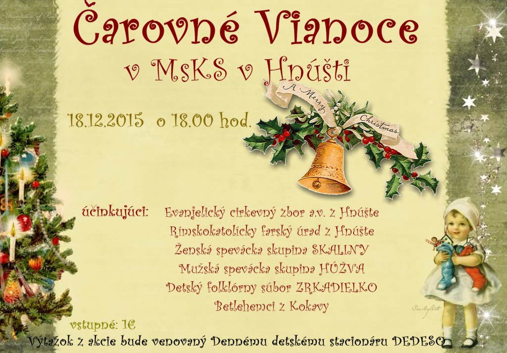 Hudbou začne aj tretí adventný týždeň. V utorok, 15. decembra o 18.00 hod. si návštevníci v divadelnej sále rimavskosobotského Domu kultúry vypočujú koncert vážnej hudby s názvom Chasidské piesne. O deň neskôr (16.12.) je pripravený vianočný program v Hnúšti, ktorý začne trhom s predajom vianočnej kapustnice. „Výťažok z predaja poputuje Dennému detskému stacionáru DEDESO, podobne ako aj zo vstupného na program Čarovné Vianoce, ktorý sa uskutoční v piatok, 18. decembra, v Dome kultúry,“ povedala Vargová, podľa ktorej súčasťou oboch podujatí bude výstava vianočných ozdôb spojená s predajom od 16. do 18. decembra.