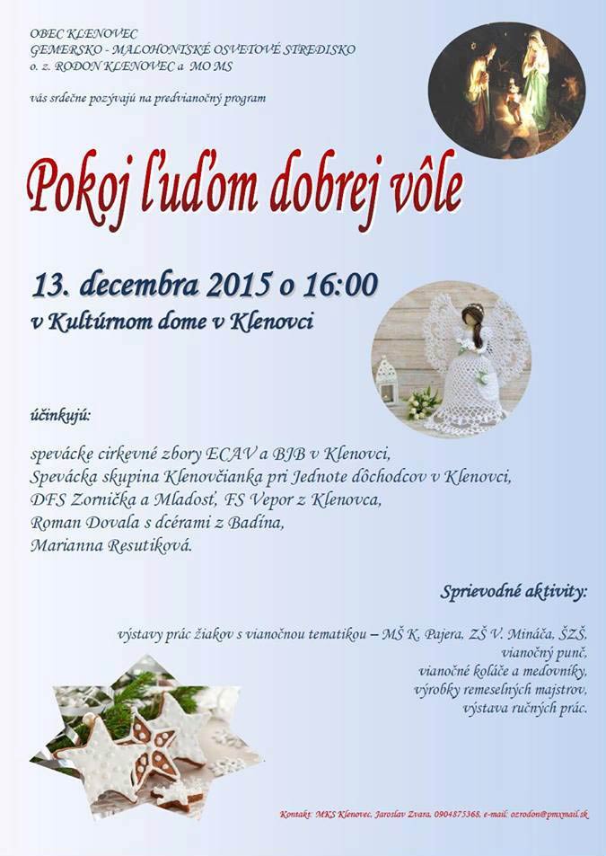 Posledný mesiac v roku je plný vianočných podujatí, na ktorých odznejú tradičné vinše a koledy, betlehemské hry, nebudú chýbať ani vianočné dobroty či tvorivé dielne ako aj divadlo.Už v prvým decembrový deň si na svoje prídu priaznivci tónov vážnej hudby. V utorok, 1. decembra si od 18-tej hodiny vo veľkej zasadačke Domu kultúry sa uskutoční koncert komorného zoskupenia Ad Libitum. Ako ďalej Rimava.sk informovala Regina Špitalová z MsKS v Rimavskej Sobote o deň neskôr (2.12.) bude Kino Orbis patriť cestovateľskému stand-up-u s názvom 40 dní pěšky do Jeruzaléma v podaní mladého českého cestovateľa Ladislava Ziburu. V stredu, 2. decembra, začína o 17.00 hod. v Evanjelickom kostole aj adventná večiereň, ktorá sa bude konať každú stredu až do 23. decembra.