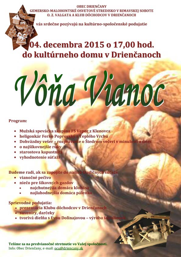 V obci Drienčany bude v tento deň rozvoniavať kapustnica a iné vianočné dobroty, s ktorými sa môžete zapojiť do súťaží prebiehajúcich počas podujatia Vôňa Vianoc. „K tomu vám budú znieť koledy a pre potešenie očí budú pripravené rôzne suveníry a darčeky,“ informovala Rimava.sk manažérka Miestnej akčnej skupinu (MAS) Malohont Miroslava Vargová. Ako poznamenala v tento deň zavíta do obcí Klenovec a Kokava nad Rimavicou Mikuláš, ktorý sa odtiaľ presunie do Hnúšte k vianočnému stromčeku, kam dorazí v nedeľu, 6. decembra, podvečer.