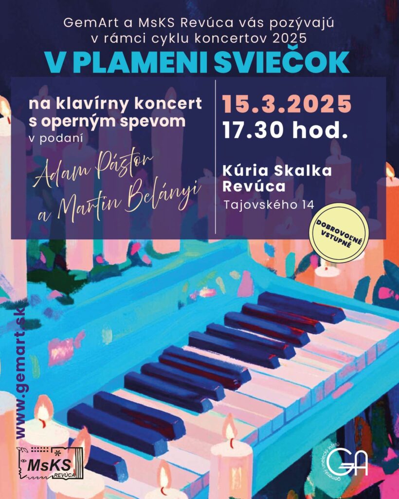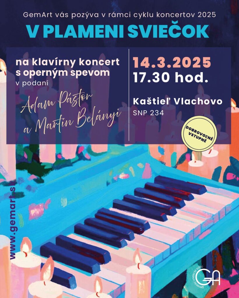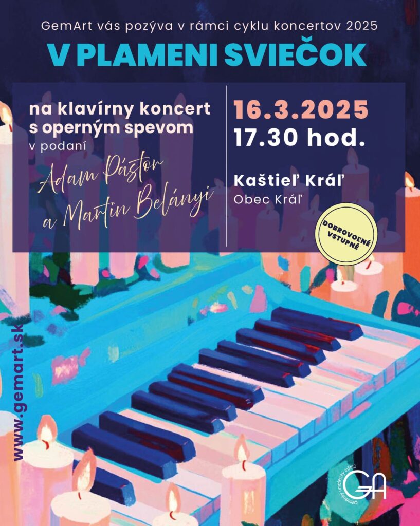 Pod hlavičkou GemArt – Gemerského umeleckého inštitútu sa tento víkend uskutoční séria troch koncertov v unikátnych priestoroch historických kaštieľov vo Vlachove, v Revúcej a v Králi. Neopakovateľná atmosféra sviečok, nádherné historické kulisy a výnimočné hudobné výkony umocnia zážitok, ktorý nadchne každého milovníka klasickej hudby.