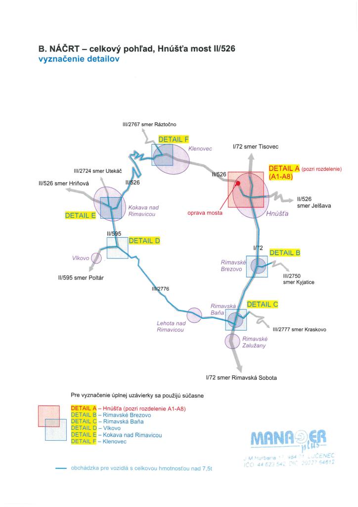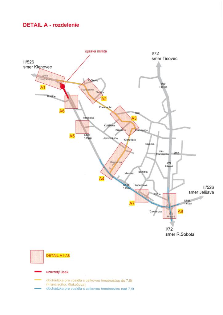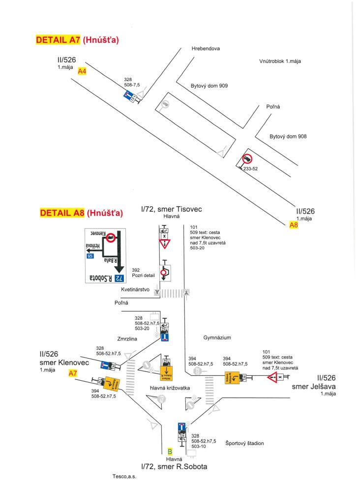 "Obchádzková trasa pre osobné motorové vozidlá, autobusy a nákladné vozidlá do 7,5 t celkovej hmotnosti bude realizovaná spoločnosťou Zedageart a.s. Bratislava v priebehu budúceho týždňa od 5. do 9. augusta. Nákladné vozidlá nad 7,5 t celkovej hmotnosti budú musieť využívať trasu cez Rimavské Brezovo, Rimavskú Baňu, Lehotu nad Rimavicou, Kokavu nad Rimavicou a Klenovec," upresnilo Oddelenie výstavby, životného prostredia a verejného obstarávania MsÚ v Hnúšti na webových stránkach mesta.