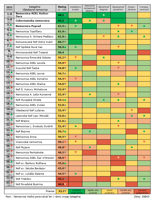 INEKO v 9. ročníku porovnávania hodnotil nemocnice podľa vybraných ukazovateľov kvality poskytovanej zdravotnej starostlivosti, operačných skúseností lekárov, náročnosti diagnóz, spokojnosti pacientov, hospodárenia a transparentnosti za obdobie 4 rokov, od 2019 do 2022.