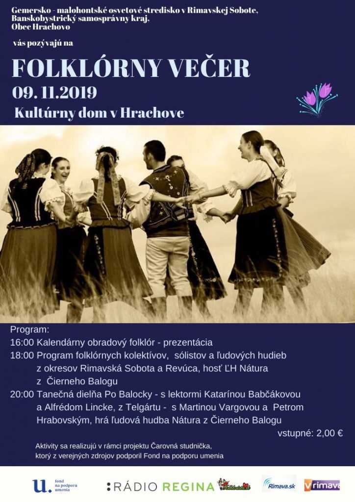 Folklórny večer je súčasťou projektu Čarovná studnička, ktorý z verejných zdrojov podporil Fond na podporu umenia. Program začína v sobotu, 9. novembra, od 16-tej hodiny v Kultúrnom dome v Hrachove.