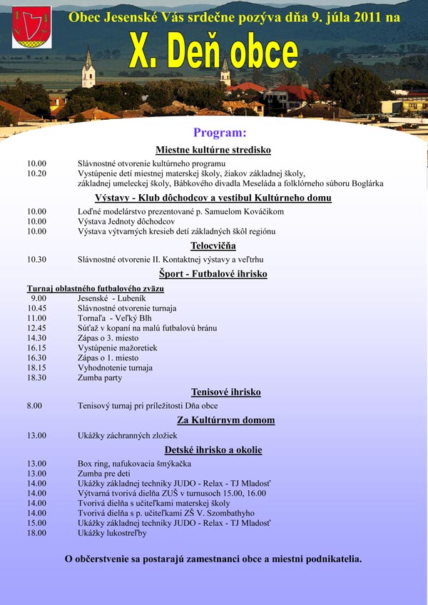 Pripravené sú aj športové podujatia, ráno o 9.00 hod. štartuje turnaj oblastného futbalového zväzu, kde si medzi sebou zahrá Jesenské a Lubeník, Tornaľa a Veľký Blh. Súčasne bude prebiehať aj tenisový turnaj, podvečer začína Zumba party. Za kultúrnym domom predvedú ukážky záchranné zložky, atrakcie čakajú aj na deti. Predstaví sa tiež oddiel džudistov či lukostrelci.