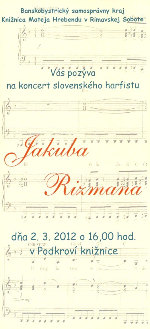 V rimavskosobotskej Knižnici Mateja Hrebendu bude dnes podvečer koncertovať harfista Jakub Rizman. Vystúpenie sa začne o 16.00 hod. v podkroví knižnice, na harfe odznejú skladby zo širokého repertoáru mladého hudobníka.