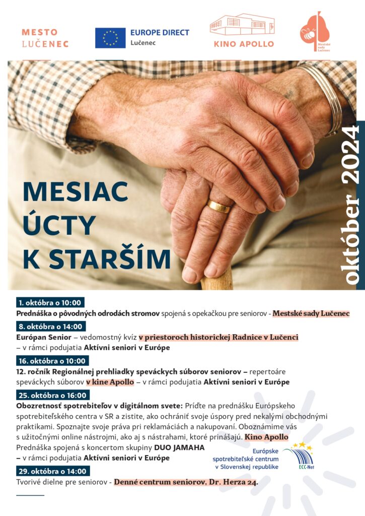 Počas celého mesiaca čaká na seniorov v Lučenci bohatý program. Už 8. októbra sa budú môcť zapojiť do vedomostného kvízu Európan senior, nasledovať bude 16. októbra 12. ročník Regionálnej prehliadky speváckych súborov seniorov. Na konci mesiaca sa pripravuje prednáška na tému ochrany spotrebiteľov v digitálnom svete, ktorú 25. októbra doplní koncert známej skupiny DUO JAMAHA. Mesiac ukončia 29. októbra tvorivé dielne.