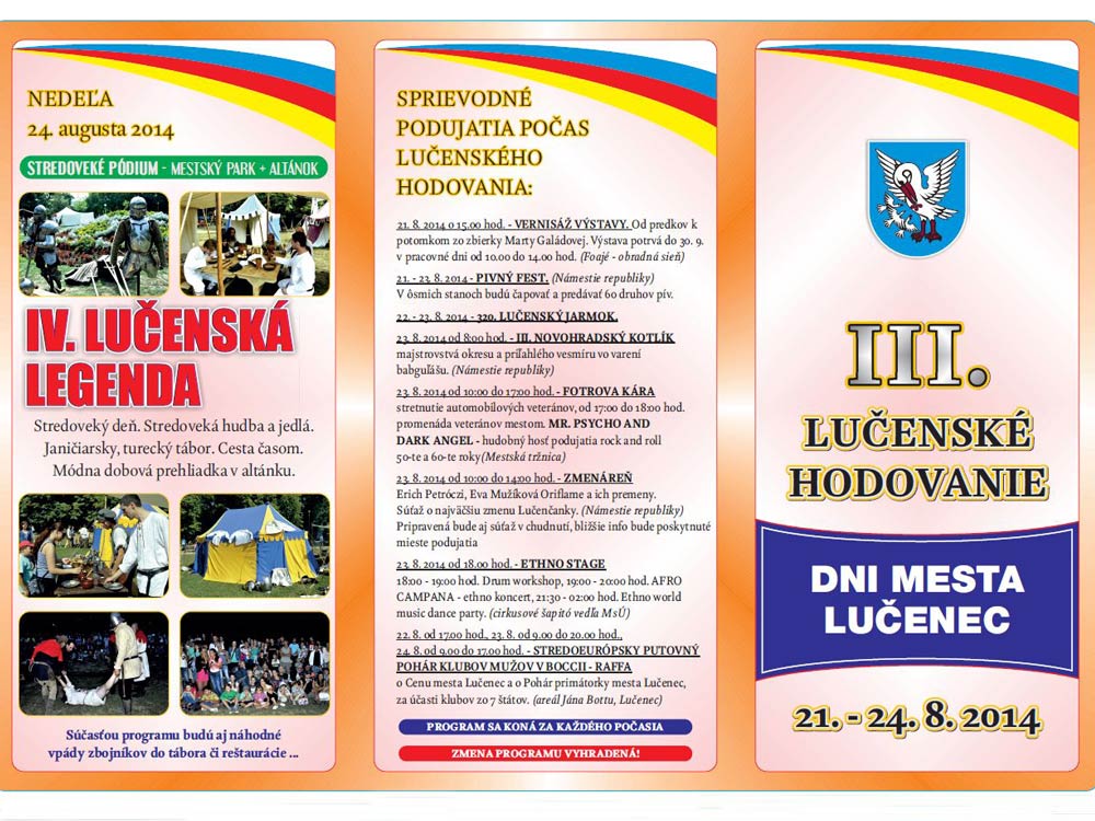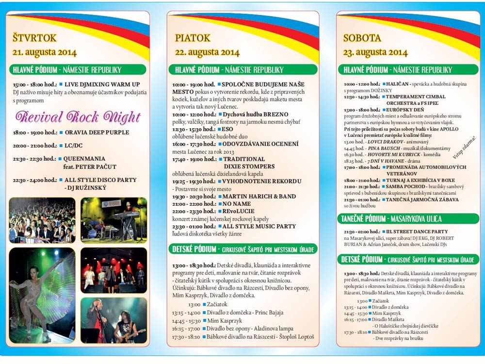 Program čaká na Lučenčanov a návštevníkov mesta už dnes podvečer, na Hlavnom pódiu na Námestí republiky vystúpia revivalové rockové kapely. V piatok sa počas dňa predstaví dychová hudba, dixielandová kapela aj lučenecké hudobné duo, samospráva odovzdá ocenenia mesta za minulý rok a počas celého dňa bude prebiehať pokus o zápis do knihy rekordov. Z kociek, kužeľov či iných tvarov má do večera vzniknúť maketa mesta, z akýchkoľvek materiálov. Rozhodujúce bude, z koľkých dielov "nový Lučenec" vyrastie. Rekord vyhodnotia večer okolo 19.30, hneď po tom bude pódium patriť Martinovi Harichovi, neskôr kapele No Name a napokon domácej rockovej formácii REvoLucie, po nej príde na rad diskotéka.