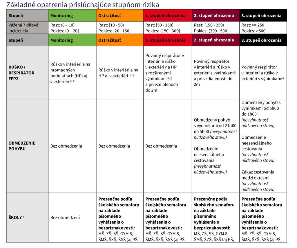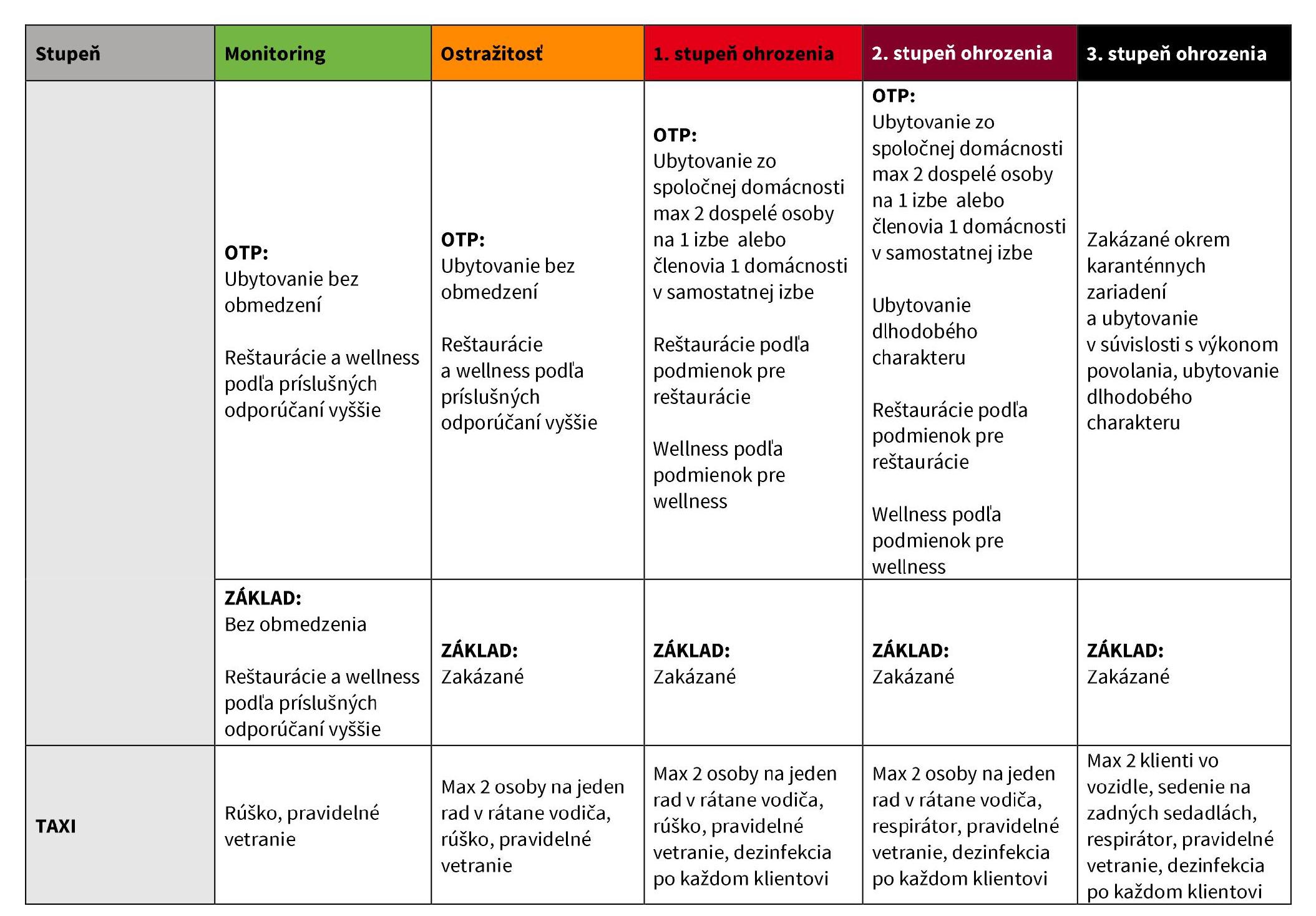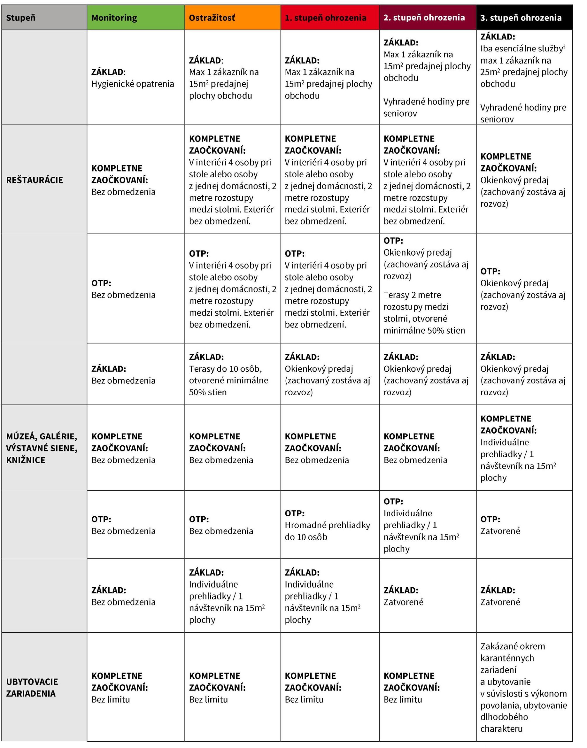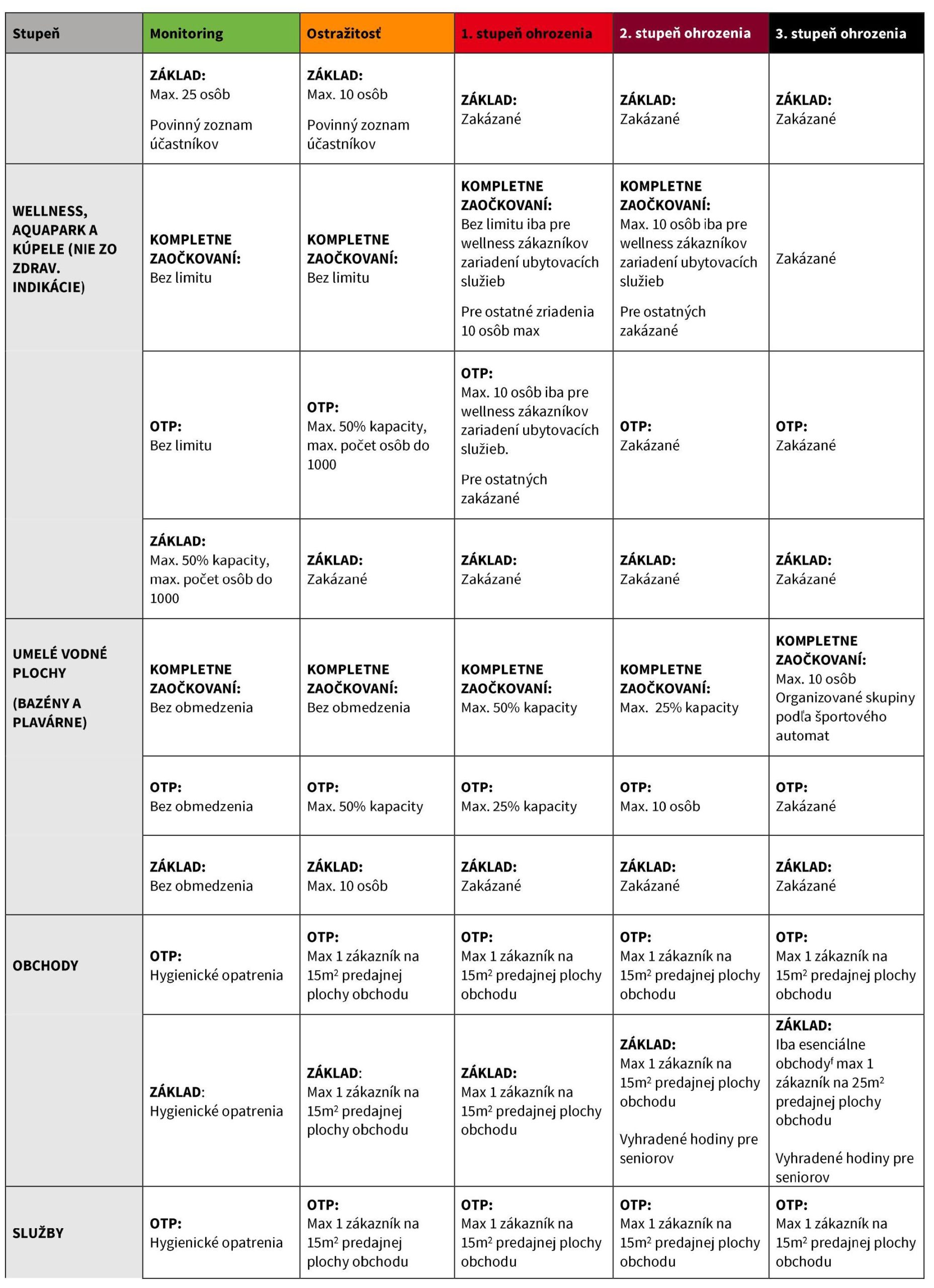 čierna: OTP - max 1 zákazník na 15 m2 predajnej plochy obchodu; základ - iba esenciálne obchody a služby a max 1 zákazník na 25 m2 predajnej plochy obchodu