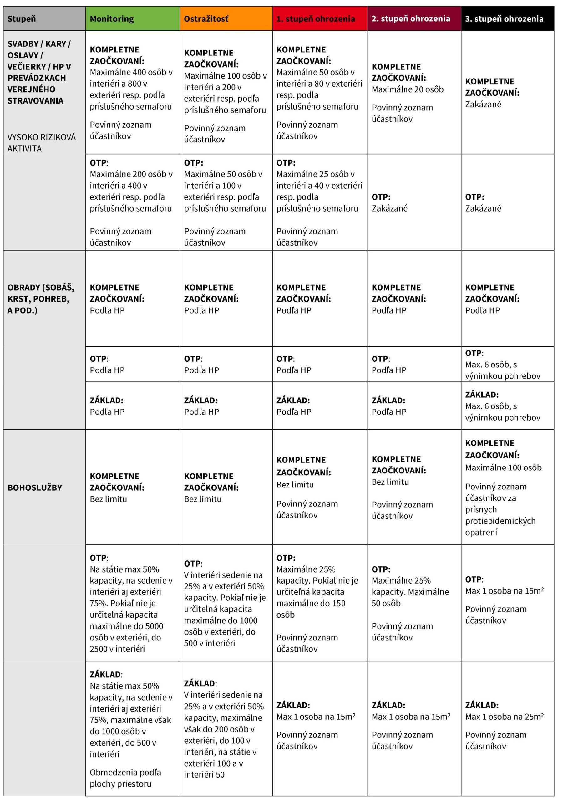 bordová: kompletne zaočkovaní - v interiéri 4 osoby pri stole alebo osoby z jednej domácnosti, dvojmetrové rozostupy medzi stolmi, exteriér bez obmedzení; OTP - okienkový predaj a rozvoz, na terasách 2 metre rozostupy medzi stolmi, otvorené minimálne 50% stien; základ - okienkový predaj a rozvoz