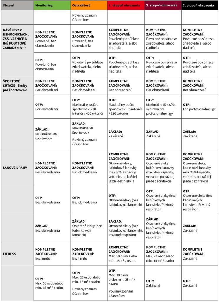 čierna: kompletne zaočkovaní - max. 10 osôb, organizované skupiny podľa športového automatu; OTP/základ - zakázané