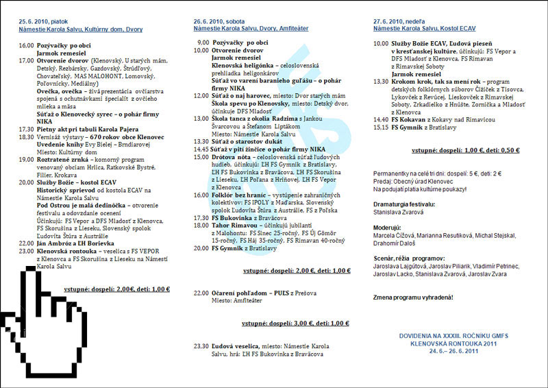 V poradí 32. ročník tradičných Gemersko-malohontských folklórnych slávností – Klenovská rontouka, sa v obci Klenovec v okrese Rimavská Sobota uskutoční už dnes. Po takzvaných „pozývačkách“ v obci sa o 17-tej hodine otvoria brány dvorov a začne trojdňový program. Festival potrvá do nedele, 27. júna.