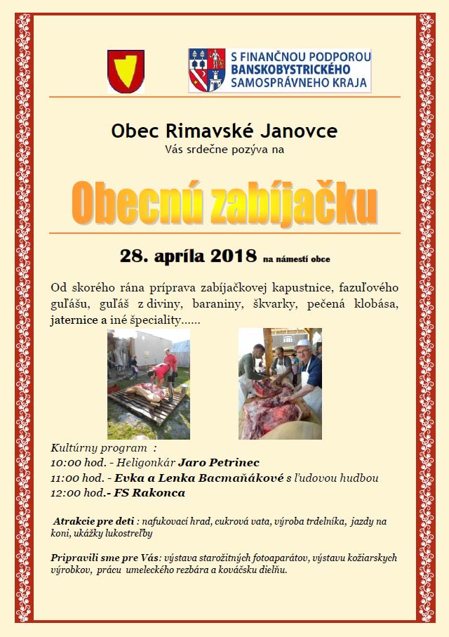 A čo všetko Vás čaká? Už od 10:00 hod. sa o dobrú náladu postará heligonkár Jaro Petrinec. Jeho neskôr vystriedajú sestry Bacmaňákové z Kysúc, Evka a Lenka, s ľudovou hudbou a na poludnie si užijete vystúpenie Folklórneho súboru Rakonca. A keďže k hudbe a tancu patrí aj jedlo, tak si celý program lepšie vychutnáte pri zabíjačkových špecialitách. Okrem toho nebude chýbať čerstvo navarený fazuľový guľáš alebo i guľáš z diviny, baraniny a po prvý raz si pochutíte aj na držkovom guľáši. „Budú ho pripravovať domáci,“ avizuje starosta obce Stanislav Krahulec.