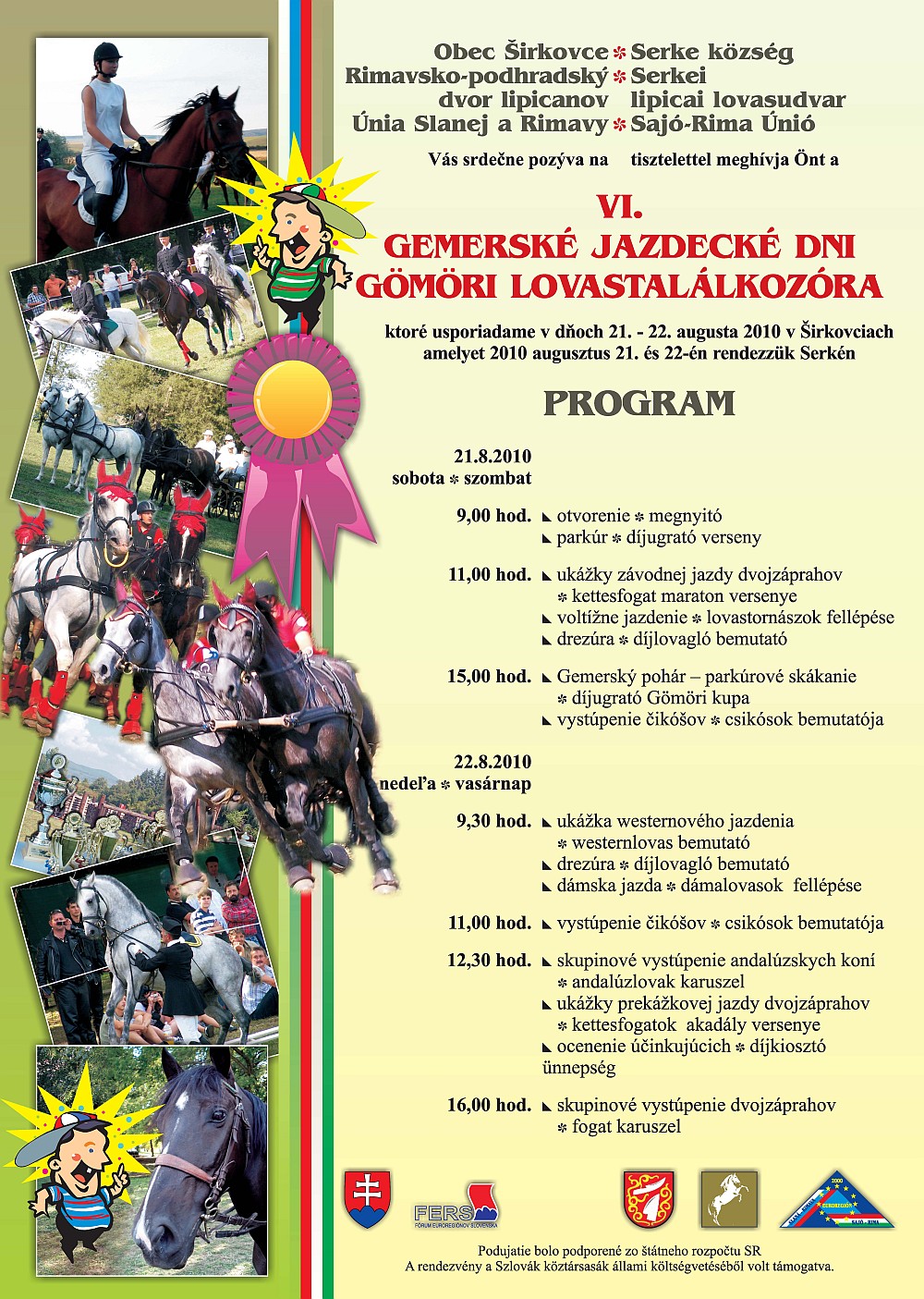 Ako Rimava.sk informoval Jaroslav Svoreň z Únie Slanej a Rimavy, ktorá je jedným z organizátorov podujatia, slávnostné otvorenie jazdeckých dní je naplánované na sobotu, 21. augusta o 9.00 hod. v zámockej záhrade. Po ňom si návštevníci môžu pozrieť ukážky jazdenia či drezúry, o 15-tej hodine začína Gemerský pohár v parkúrovom skákaní. Program pokračuje aj v nedeľu, 22. augusta so začiatkom o 9.30 hod. , okrem iného je pripravené aj vystúpenie čikóšov, pastierov koní.