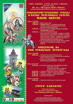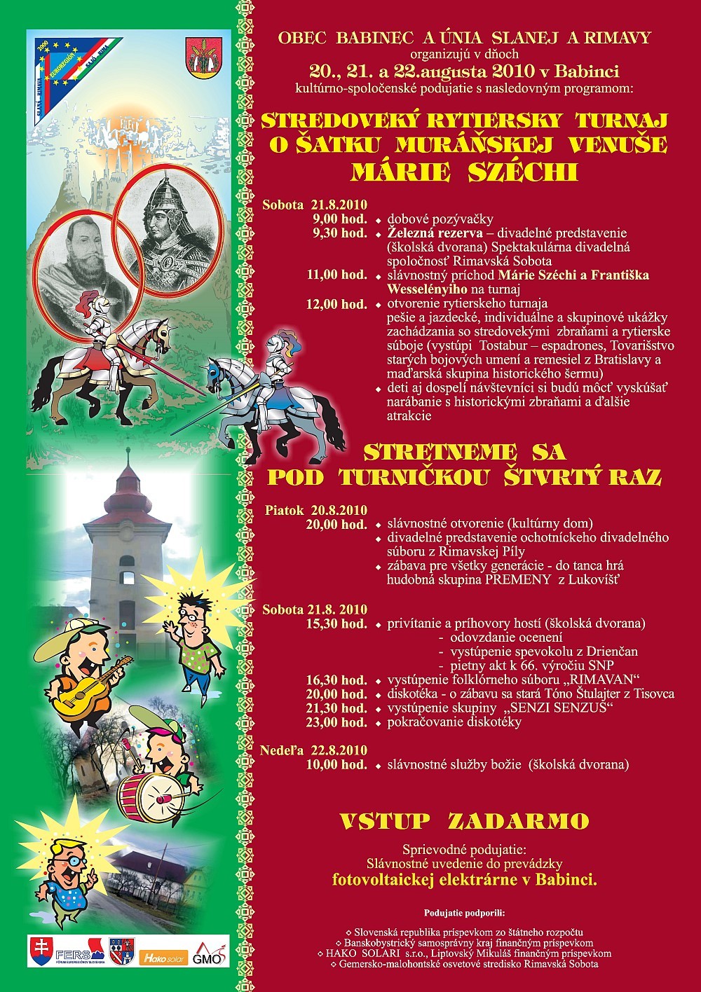 V ten istý augustový víkend sa v obci Babinec bude konať Stredoveký rytiersky turnaj o šatku muránskej Venuše Márie Széchi. Dopoludnia sa predstaví Spektakulárna divadelná spoločnosť z Rimavskej Soboty, samotný rytiersky turnaj začne na pravé poludnie. Postará sa oň Tovarišstvo starých bojových umení a remesiel z Bratislavy. Ako organizátori avizujú, súčasťou turnaja budú individuálne aj skupinové ukážky zachádzania so stredovekými zbraňami a rytierske súboje. Dospelí aj deti si budú môcť vyskúšať narábanie s historickými zbraňami a ďalšie atrakcie.