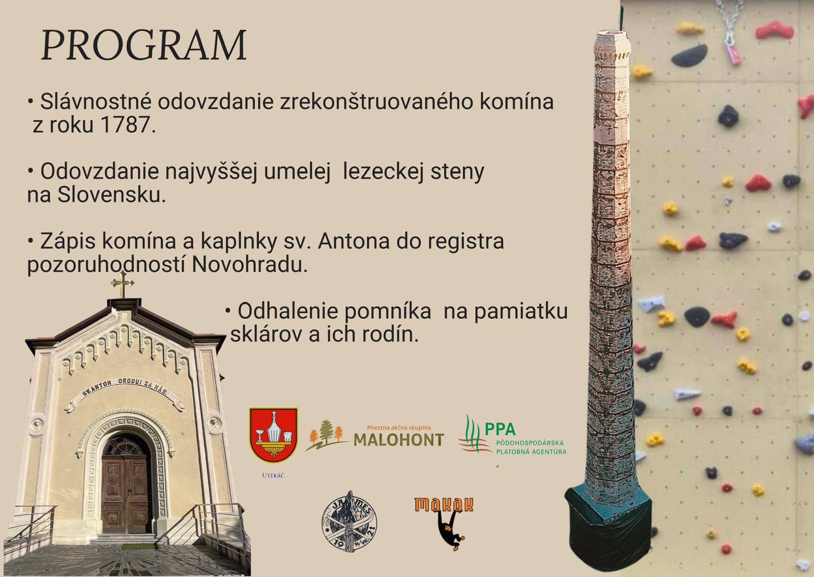 Súčasťou programu bude aj slávnostný zápis komína a Kaplnky sv. Antona do registra pozoruhodností regiónu Novohrad. Kaplnka sv. Antona je ďalšou z miestnych historických pamiatok, ktorá pripomína význam a dedičstvo sklárskeho remesla v tejto oblasti. Navyše, odhalí sa pamätník venovaný sklárskym majstrom a ich rodinám, ktorí sa pričinili o rozkvet sklárstva v Utekáči a jeho okolí.