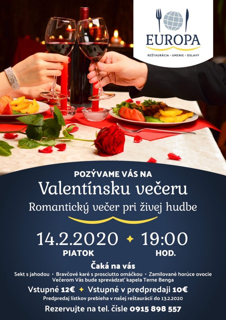Oslávte svoju lásku na sviatok svätého Valentína v príjemnom prostredí s chutným jedlom. V Reštaurácii Európa sľubujú nezabudnuteľný gastronomický aj hudobný zážitok pre zamilovaných pri živej hudbe. Melódie kapely Terne Benga dotiahnú Váš romantický večer do dokonalosti. Podľa slov majiteľa reštaurácie Ladislava Györgya z Rimavskej Soboty v novootvorených priestoroch zákazníkov vítajú od konca minulého roka. Za tak krátku dobu stihli zorganizovať Štefanskú, či Silvestrovskú zábavu a najbližšie ich čaká Valentínska večera.