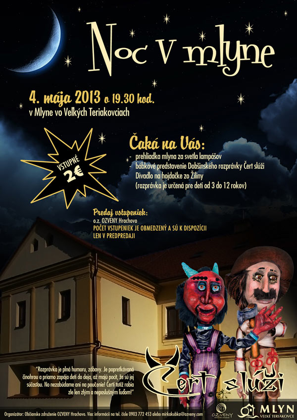Kto by to bol povedal, že peklo vie byť spravodlivé a čerti pracovití? Ale kým sa tak stane, nejedny mozole na rukách si zoderú. V sobotu, 4. mája o 19.30 hod. Vás o tom presvedčí bábkové divadelné predstavenie Dobšinského rozprávky Čert slúži, ktorým otvoria tohtoročnú sezónu v mlyne vo Veľkých Teriakovciach. Ako pre Rimava.sk potvrdila Miroslava Kubaliaková z občianskeho združenia Ozveny, pre malých aj veľkých opäť pripravili obľúbenú Noc v mlyne.