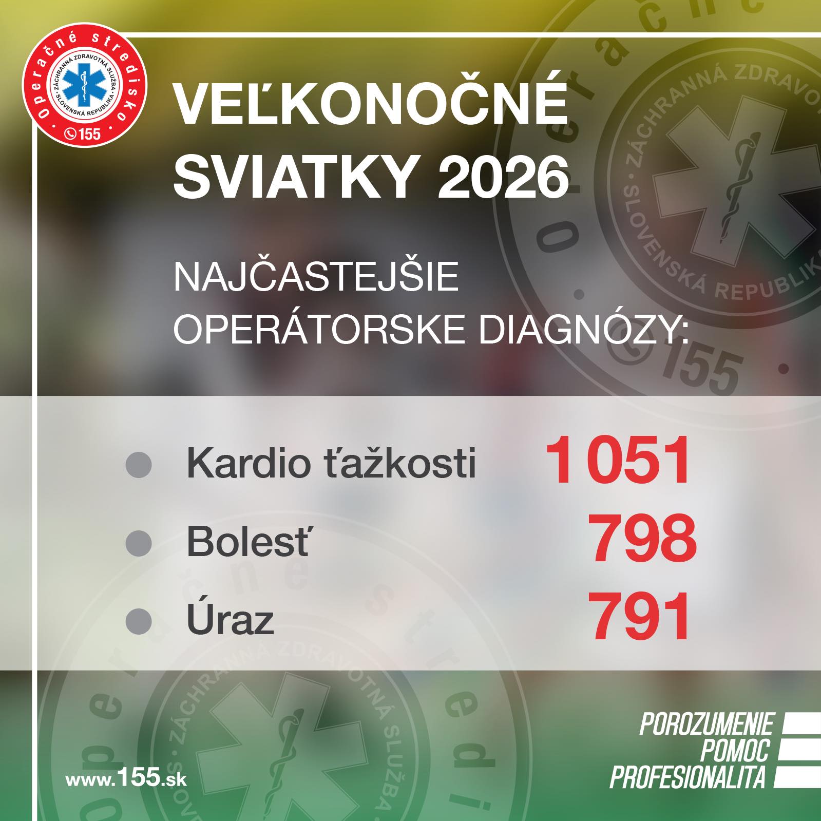 Operačné stredisko záchrannej zdravotnej služby (OS ZZS) SR zverejnilo štatistiky zásahov počas tohtoročných veľkonočných sviatkov. Operátori tiesňovej linky 155 čelili náporu tisícok volaní, pričom sanitky vyrážali do terénu v tisíckach prípadov.