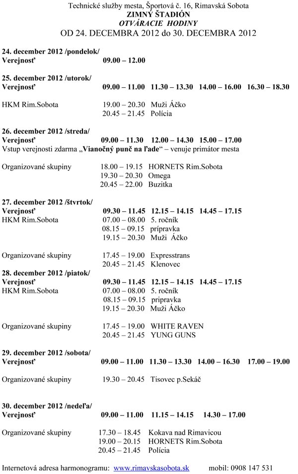 Zimný štadión bude počas Štedrého dňa a Silvestra otvorený od 9.00 hod. do 12.00 hod. na Nový rok bude zatvorený. Na druhý sviatok vianočný bude korčuľovanie pre verejnosť zadarmo.