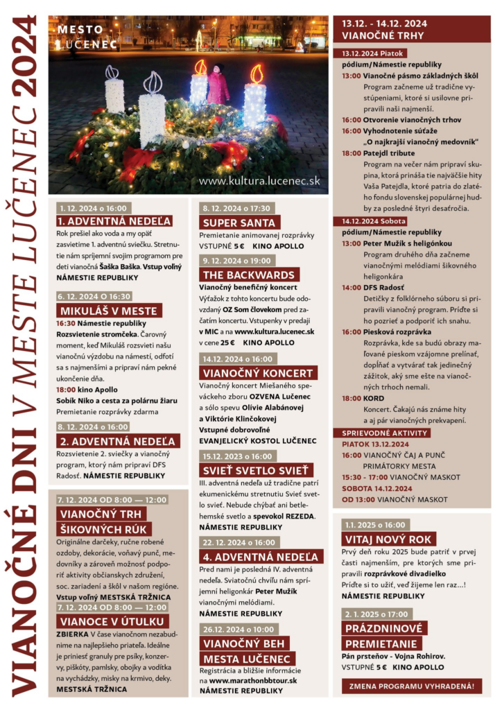 LUČENEC – Aj centrum Novohradu sa pripravuje na vianočné sviatky. V Lučenci bude december nabitý programom. Prinášame vám prehľad podujatí počas adventného obdobia.