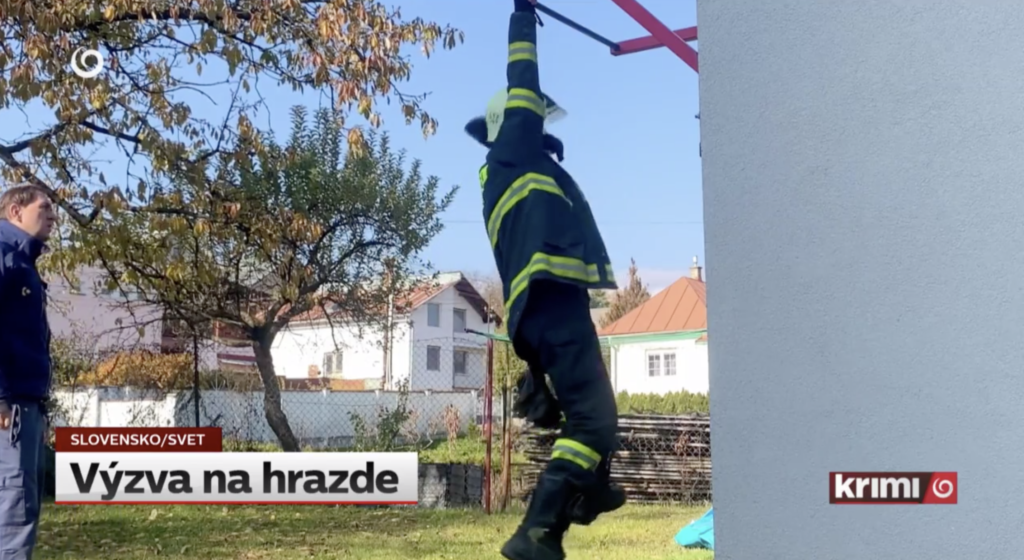 Ide o #hrazdachallenge, ktorej úlohou je obliecť si v čo najkratšom čase zásahovú výstroj. Háčik je v tom, že musia visieť na hrazde a nemôžu sa vôbec dotknúť zeme.