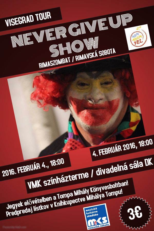 Mestské kultúrne stredisko vo februári pozýva na Never Give Up Show, obohatenú zábavnými scénkami klaunov a kúzelníkov. Neopakovateľný zážitok všetkým, ktorí prídu vo štvrtok, 4. februára o 18.00 hod. do divadelnej sály Domu kultúry, sľubujú tvorcovia a herci, mentálne a telesne postihnutí ľudia a ich zdraví priatelia z Nadácie NemAdomFel. Do nášho mesta sa dostali v rámci turné, ktoré podporil Vyšehradský fond. Program mal premiéru v Nemecku na jeseň 2015 a od nás zas poputuje do poľského Krakova. Vstupné: 3€ / predpredaj v Kníhkupectve M. Tompu.