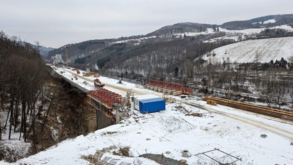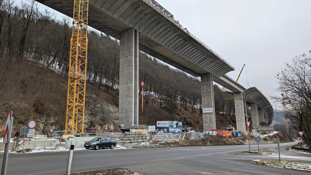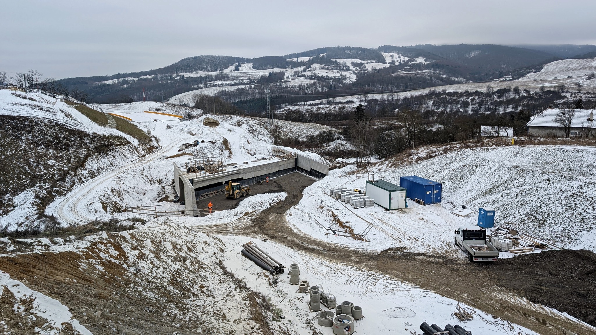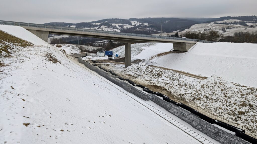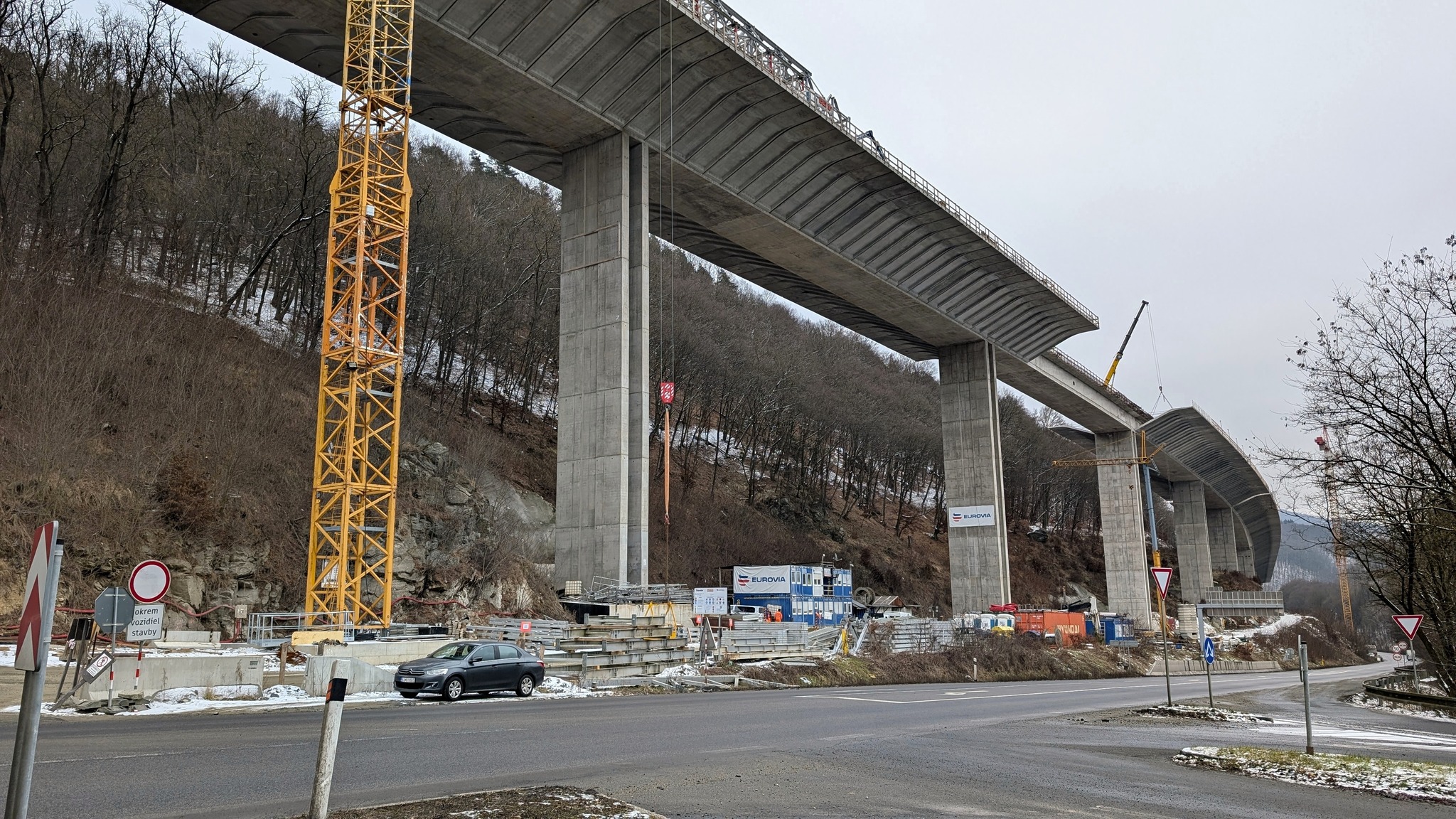 Stavebné práce na rýchlostnej ceste R2 Kriváň – Mýtna napredujú aj počas zimného obdobia. V týchto dňoch sa sústredili aktivity na kladenie vzpier na nosnej konštrukcii estakády, betónujú sa konzoly a rímsy.