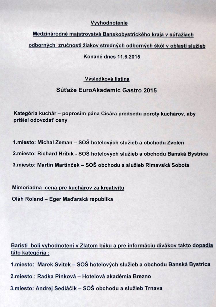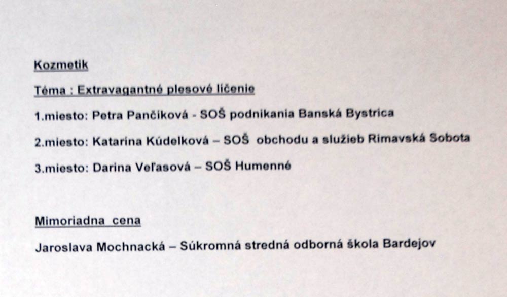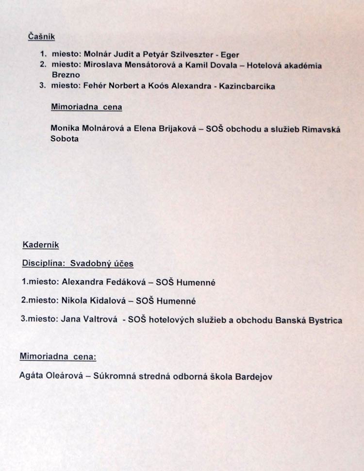 Domáca a zároveň usporiadateľská škola si v silnej konkurencii odniesla niekoľko ocenení. V kategórii kuchár si tretie miesto odniesol Martin Martinček. Michaela Púpalová sa stala víťazkou kategórie obchodný pracovník s témou svadobné balenie. Na druhom mieste medzi obchodnými pracovníkmi skončila Annamária Berkyová. Spomedzi kozmetikov, ktorí mali tému extravagantné plesové líčenie si druhé miesto odniesla Katarína Kúdelková. V kategórii barman sa najlepšie darilo Lucii Kovaľančíkovej, ktorá sa umiestnila na treťom mieste.
