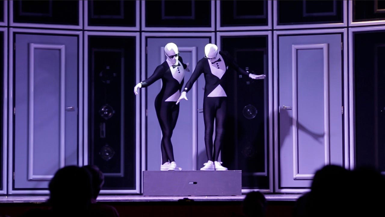 [su_media url="https://www.youtube.com/watch?v=9MlZT29G-z0" width="600" height="400"]V neprítomnosti tanečníkov divákov zabávajú dve postavy bez tvárí humornými pohybovými scénkami, v ktorých miešajú prvky breaku a pantomímu. Viac ako hodinová šou je vďaka nim presiaknutá humorom a narážkami na známe filmy z prostredia divokého Západu (duel pištoľníkov) alebo tanečného sveta Flashdance, krátkymi „pripomenutiami“ tanečných hitov ako Macarena a Asereje či postáv hudobných velikánov ako Michael Jackson.