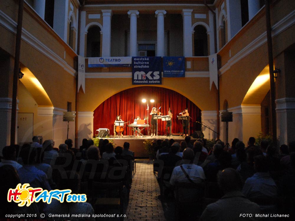 Na nádvorí Čierneho orla sa uplynulý víkend začínal aj končil koncertami. Piatkový večer patril dámskemu kvintetu Afrodíté. Pôvabné dámy z Bratislavy zahrali známe filmové a muzikálové melódie či populárnu hudbu 20. storočia v originálom orchestrovom prevedení.