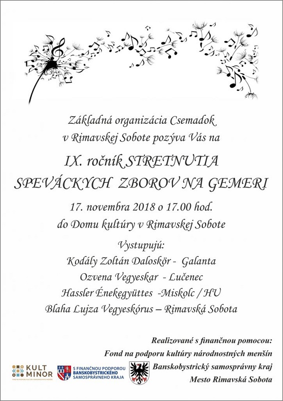 Sobota, 17. novembra, bude patriť aj koňom. Na Salaši Zbojská čaká na Vás Zbojnícka jazda, kde na Vás čaká zbojnícke pólo, zbojnícke barely či dostih. Začiatok je o 10:00 hod. V Rimavskej Sobote to však bude aj o tvorení. Uzdy svojej kreativite popustia deti v Mestskej galérii, kde na nich čaká Tvorivá sobo s Petrou. Spoločne s ňou sa pozrú na to, ako rôzni umelci pristupovali k námetu autoportrétu či prečo si tak často robili umelci zo seba srandu. Podvečer bude patriť 9. ročníku Stretnutia speváckych zborov na Gemeri. V rimavskosobotskom Domu kultúry sa o 17:00 hod. stretne niekoľko zborov, a to nielen tunajšie, ale svoje umenie predvedú aj ďalšie zbory z blízka i ďaleka.