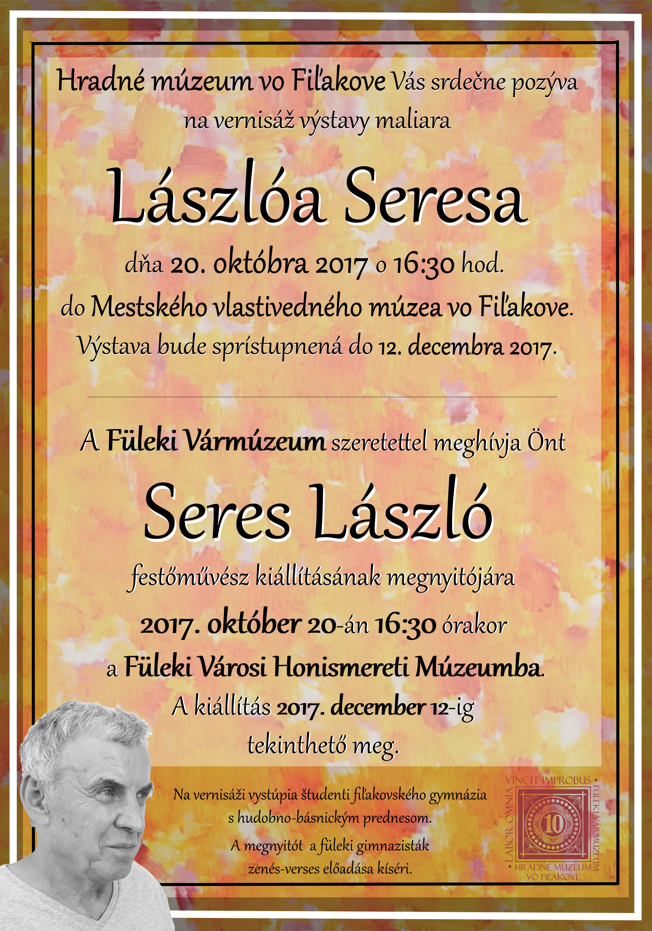 Rovnako aj Novohrad bude žiť umením. Hradné múzeum vo Fiľakove otvorí dnes, 20. októbra o 16:30 hod. autorskú výstavu maliara a reštaurátora Lászlóa Seresa. Fiľakovský rodák, ktorý v súčasnosti žije v Miškovci, študoval na vysokej škole výtvarnej v Budapešti a následne sa v New Yorku venoval grafike a maľbe. Neskôr si založil reštaurátorské dielne, jednu v Indii a druhú v Japonsku, ktoré pravidelne navštevuje. Ako ďalej Rimava.sk informovala riaditeľka Hradného múzea Viktória Tittonová, László Seres je predstaviteľom maďarského abstraktného expresionizmu šesťdesiatych a sedemdesiatych rokov. „Po dlhoročnej prestávke sa v roku 2006 opäť vrátil k maľovaniu a tvorí dodnes,“ priblížila Tittonová.
