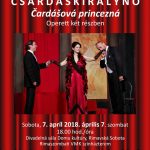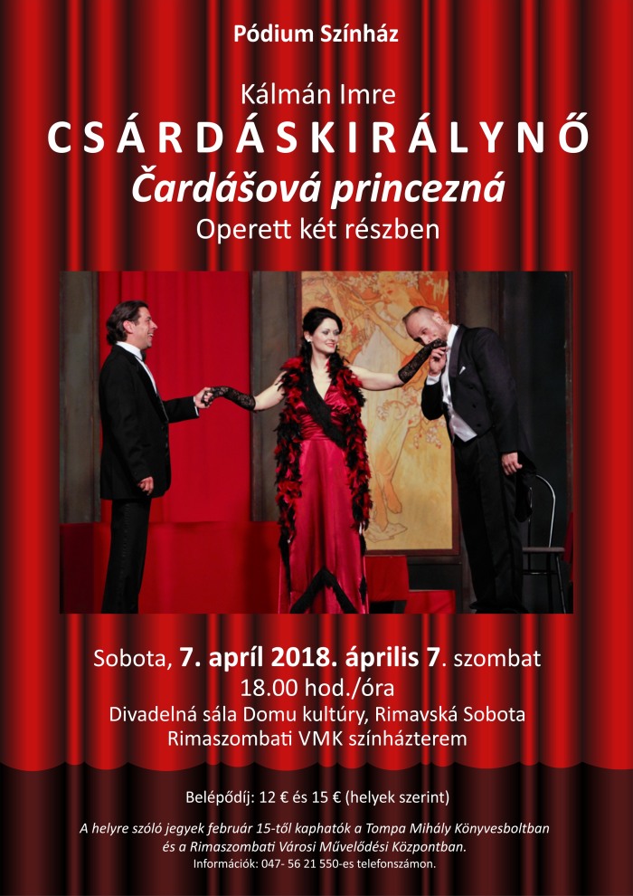 Ak ste ale z Rimavskej Soboty tak do tretice si hudbu i herecké výkony užijete v divadelnej sále Domu kultúry. Jeho dosky budú od 18:00 hod. patriť najznámejšej operete, ktorú zložil Imre Kálmán, Čardášová princezná. Premiéra sa konala vo Viedni v roku 1915 a v Budapešti o rok neskôr. Bola úspešná aj napriek zúriacej prvej svetovej vojne a ešte počas nej sa dostala aj cez frontovú líniu do Ruska a New Yorku. Už vyše sto rokov je „kráľovnou“ sveta operiet. V Rimavskej Sobote ju budeme môcť vidieť v podaní umelcov divadla Pódium Színház z Budapešti. Predpredaj vstupeniek je v kníhkupectve Mihálya Tompu (I-XII.rad) a MsKS Rimavská Sobota (XIII-XX.rad).