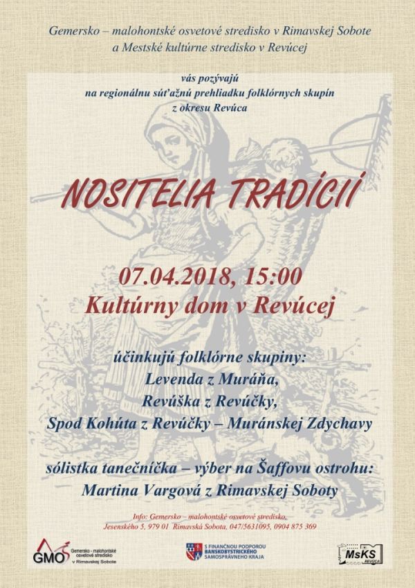 Prvému aprílovému víkendu bude priať aj počasie. To je o dôvod naviac stráviť dva voľné dni relaxom a zábavou, o ktoré sa postarajú pripravované podujatia v regióne Gemer-Malohont. Pozrite si ponuku, kam sa za nimi vydať.Prvý voľný deň, sobota (7.4.) začne regionálnou prehliadkou folklórnych skupín z okresu Revúca. Prehliadka nesie názov Nositelia tradícií, v ktorej sa predstavia folklórne skupiny Levenda z Muráňa, Revúška z Revúcej, Spod Kohúta z Revúčky z Muránskej Zdychavy ako aj sólistka tanečníčka Martina Vargová z Rimavskej Soboty. Hudbu a spev si užijete v Kultúrnom dome v Revúcej od 15-tej hodiny. Organizátormi podujatia je Gemersko-malohontské osvetové stredisko v Rimavskej Sobote a Mestské kultúrne stredisko v Revúcej. Cestou z Revúcej sa môžete zastaviť a zaspievať si v Hnúšti na koncerte známeho speváka ľudových piesní Jána Ambróza, ktorý sa predstaví aj s ľudovou hudbou Borievka. V Hnúšti sa predstavia po 20-tich rokoch. Dejiskom hudobného zážitku bude od 18:00 hod. Kultúrny dom v Hnúšti.
